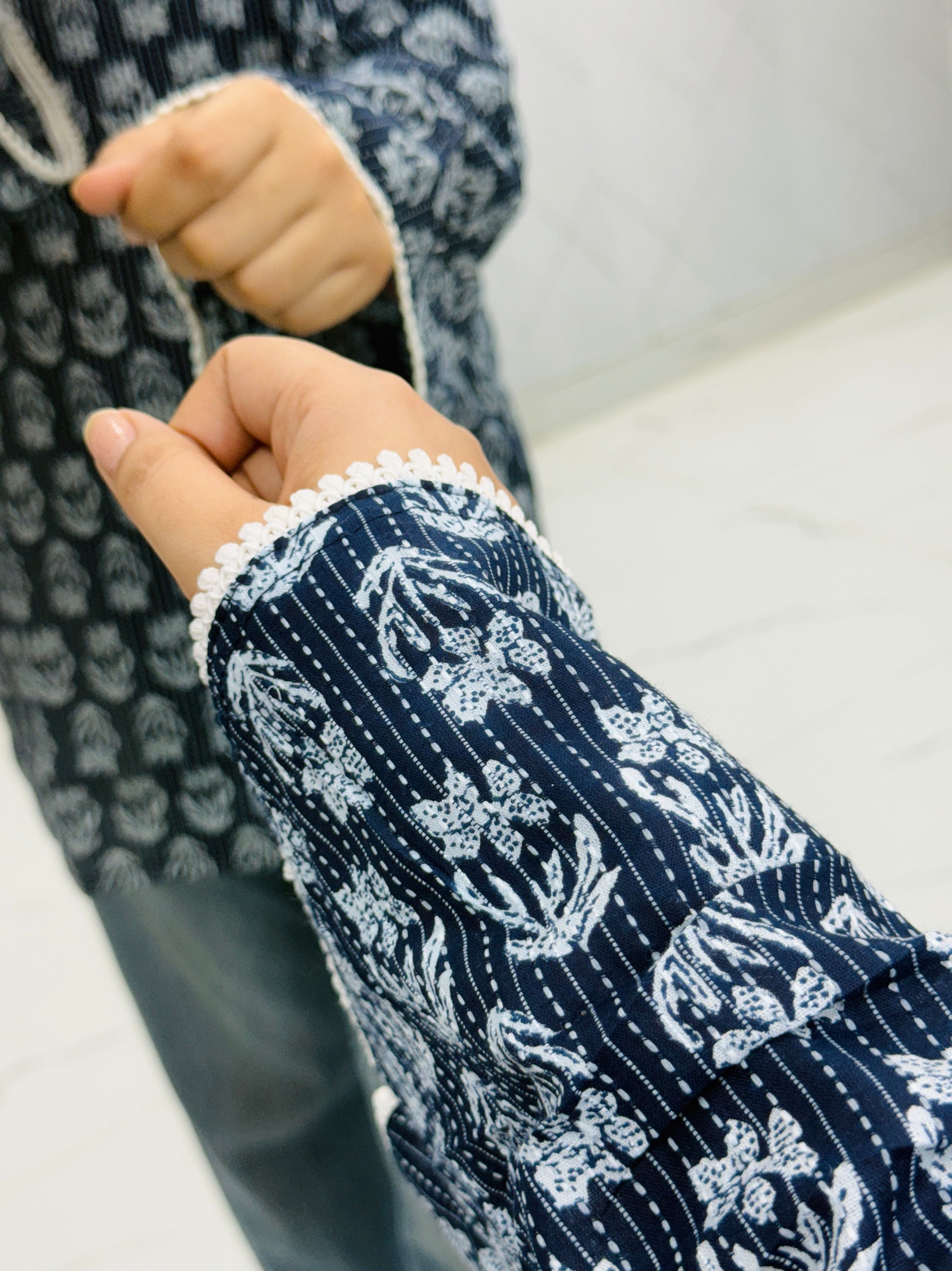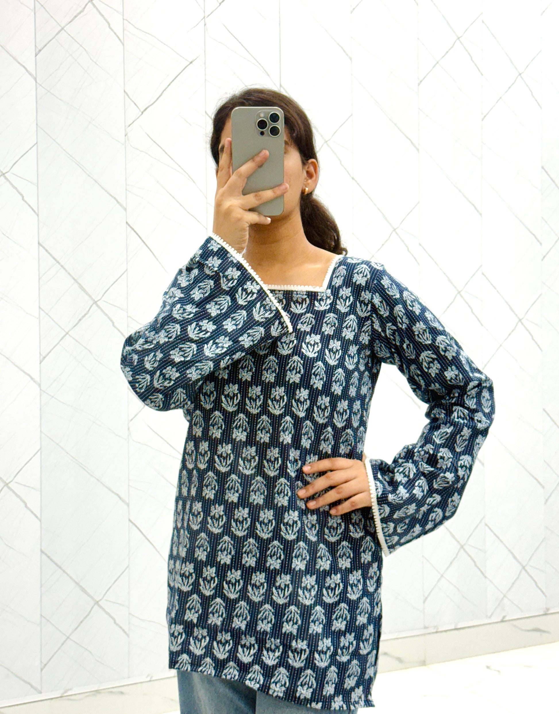 Kantha Navy Blue Balloon Sleeve Straight Kurti